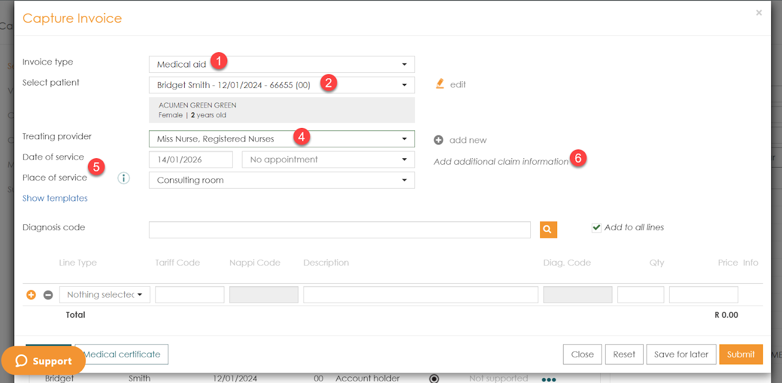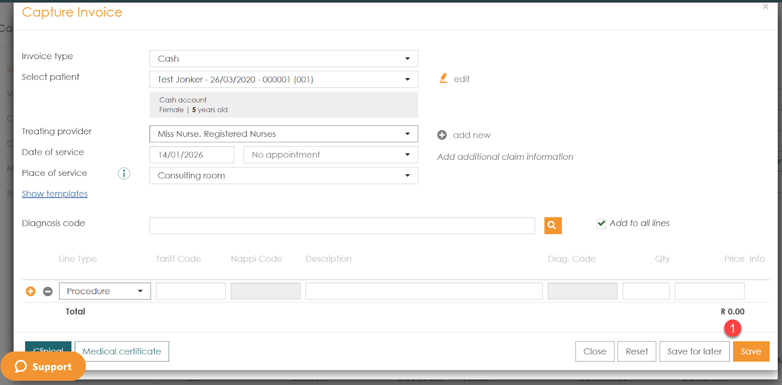 - Line Items: Select the Line Type (e.g., Procedure) and ensure the Tariff Code is correct.