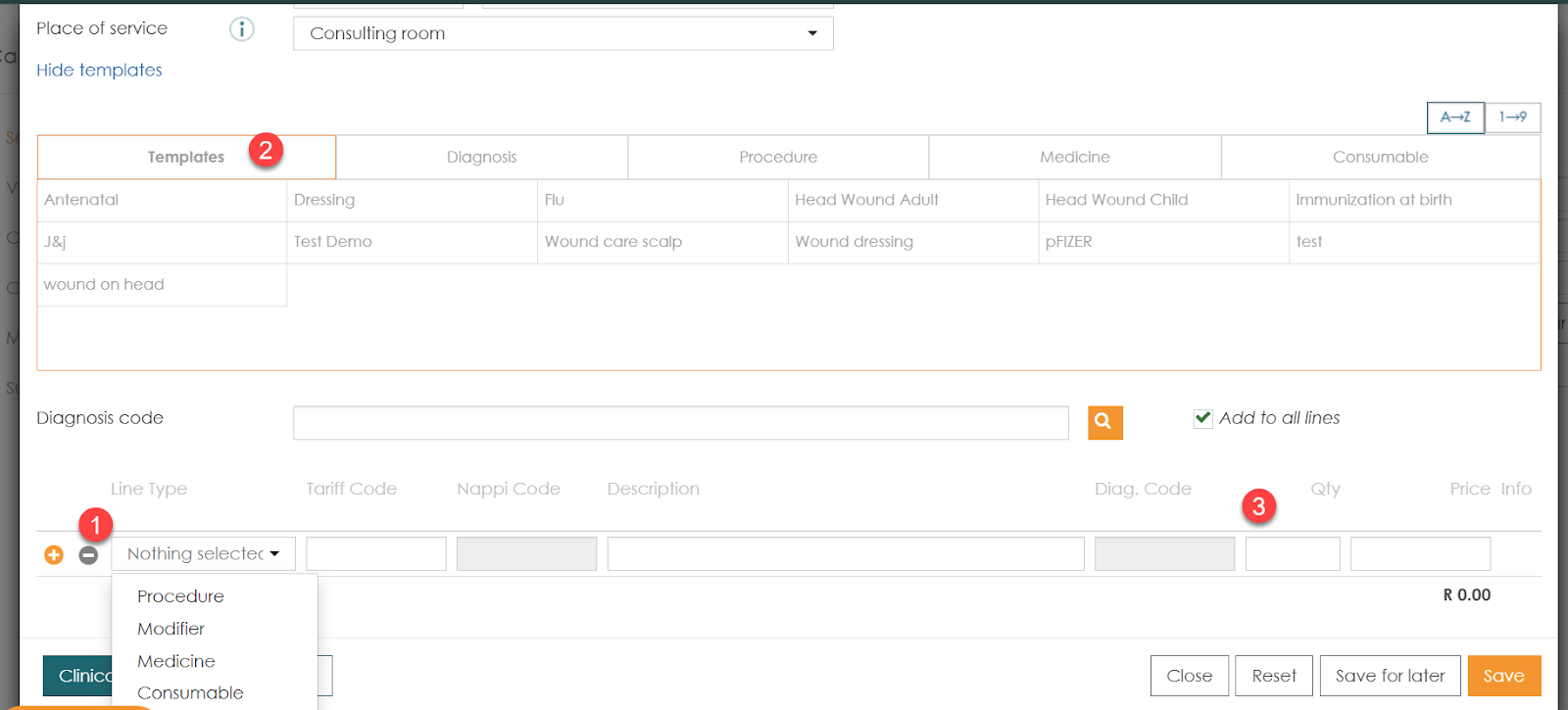 - Date and Place of Service: The date defaults to today, and the place defaults to Consulting Room.