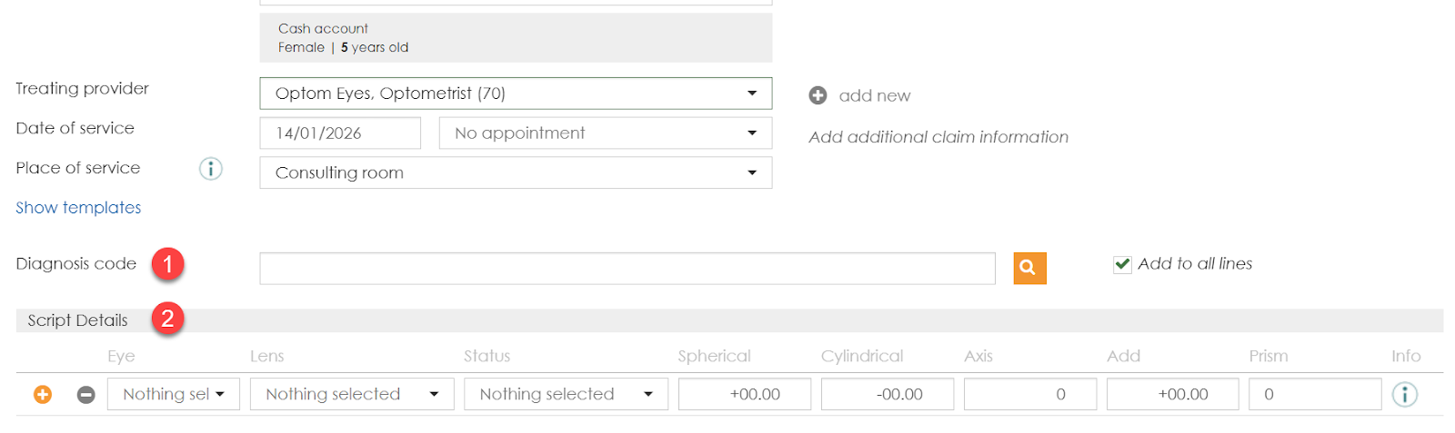 - Script Details (For Optometry): Add script details for both eyes. Use the info (i) icon for extra eye-specific details required for PPN-linked medical aids.